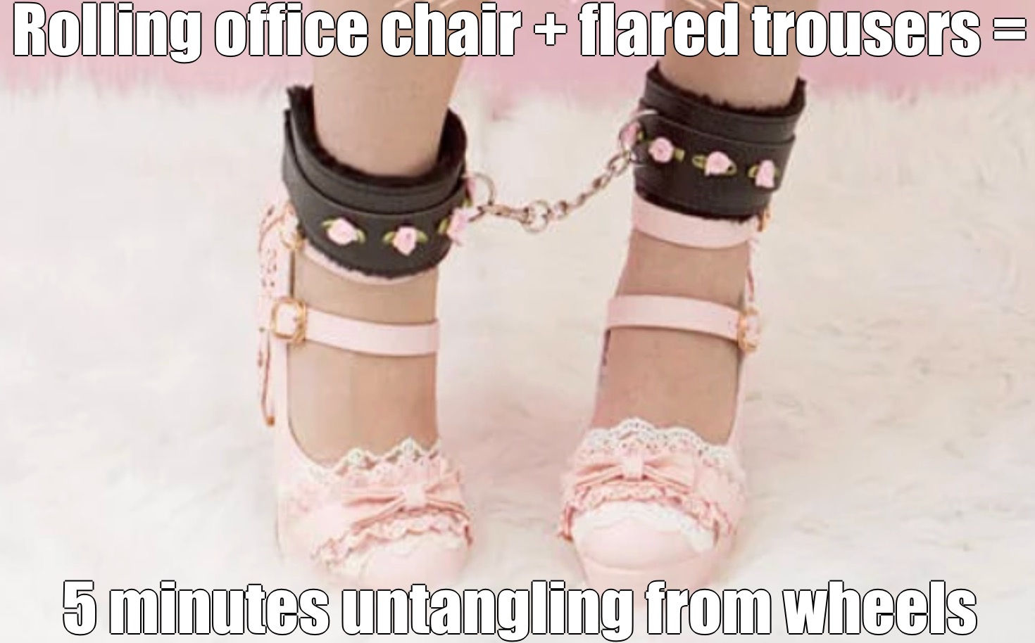 I work about 1 metre down from where I sleep (one of those loft/sleeper/desk combos where trousers only even matter during certain teleconferences, or if someone insists on watching. Nearly all my trousers are flared, because if I trip, people don’t tend to die (I’ve had no reports of that, anyway), and I also never needed scrubs. I barely need trousers on occasion.