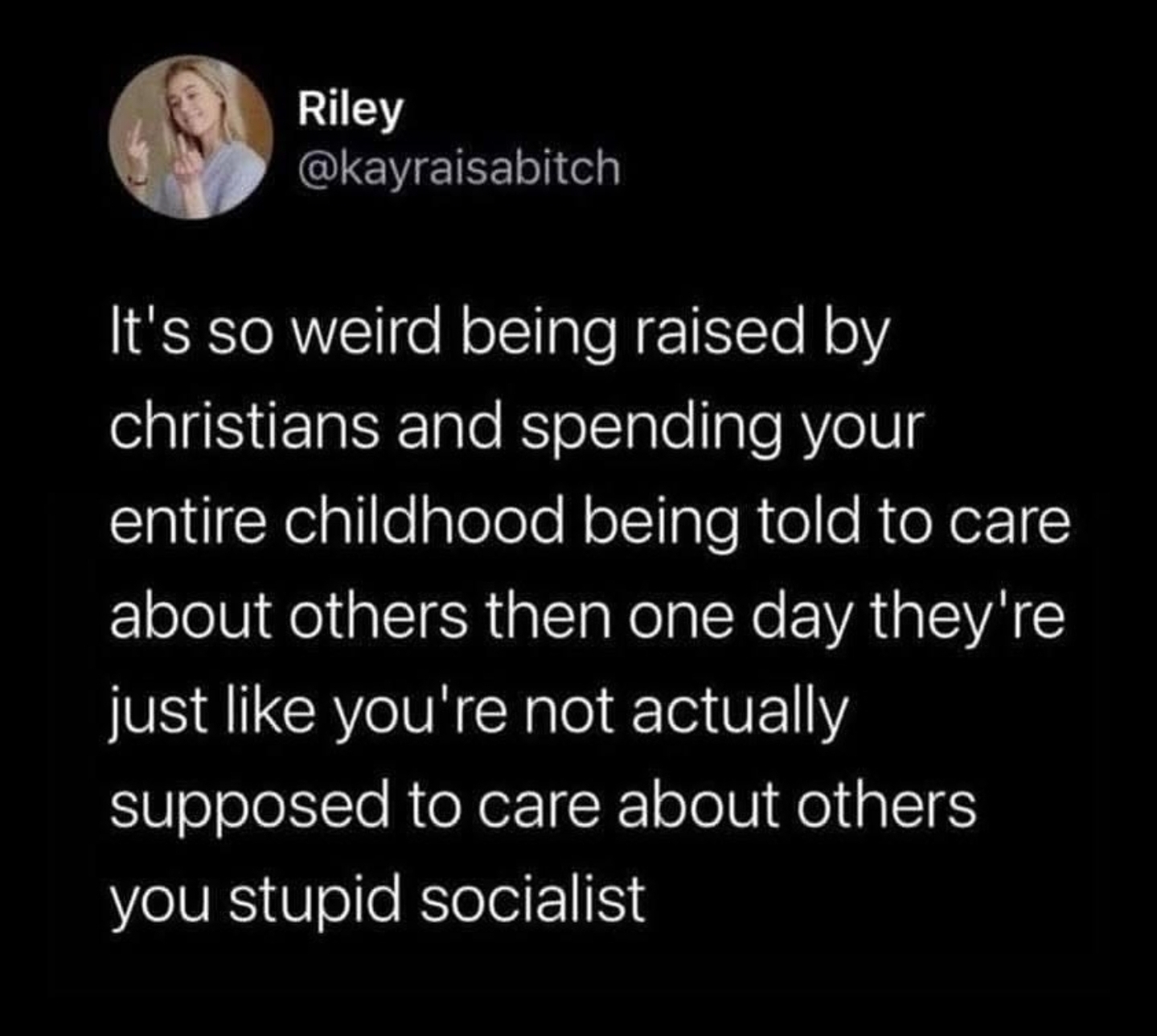 Also, I find american Christians weird. They twist and contort Christianity into something to suit their ideological needs, racism, homophobia, capitalism, nationalism, unilateralism, etc.