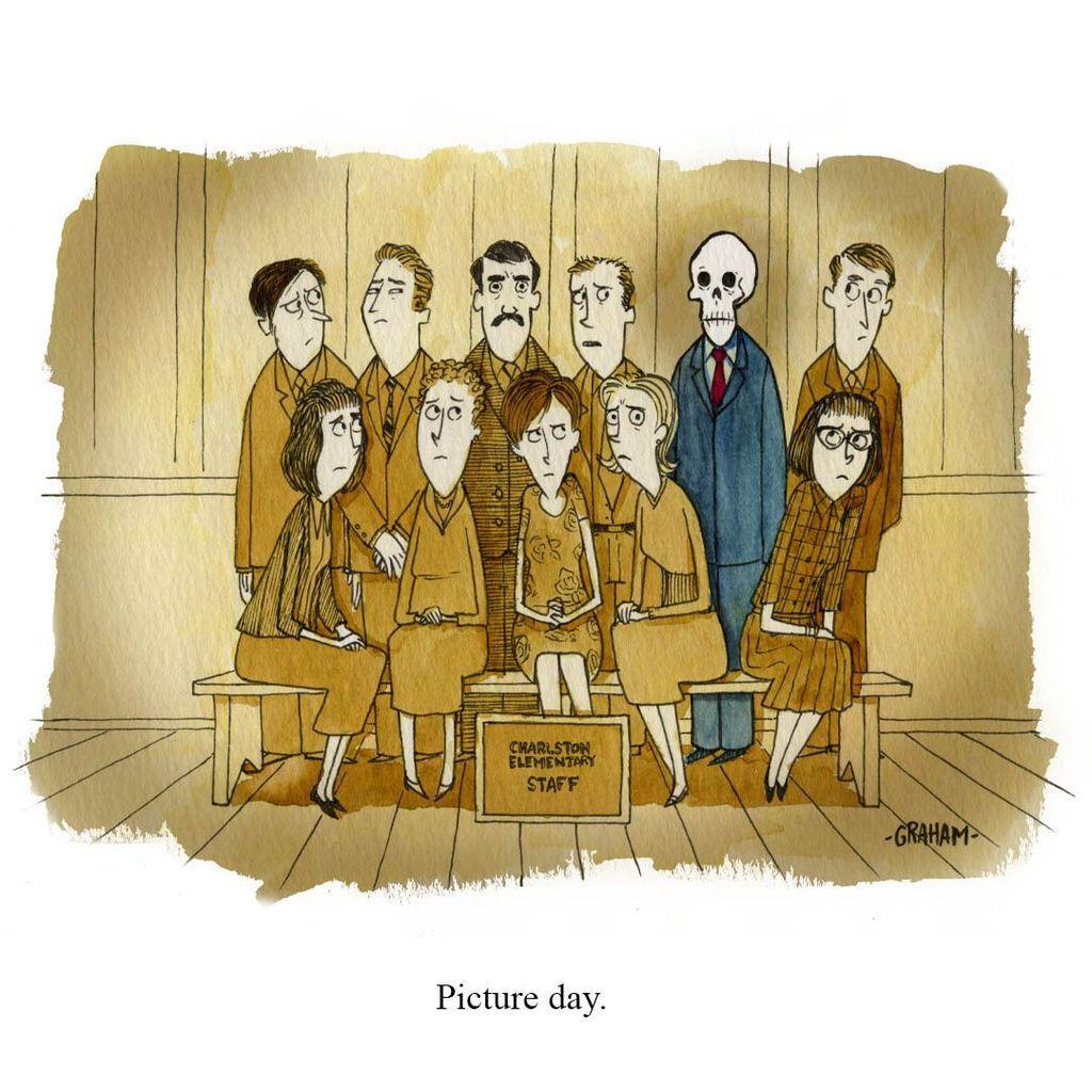 Alt Text: A cartoon illustration of a teachers sitting for a staff photo looking worriedly at the principal who is a skeleton in a suit. Caption reads “Picture day.”