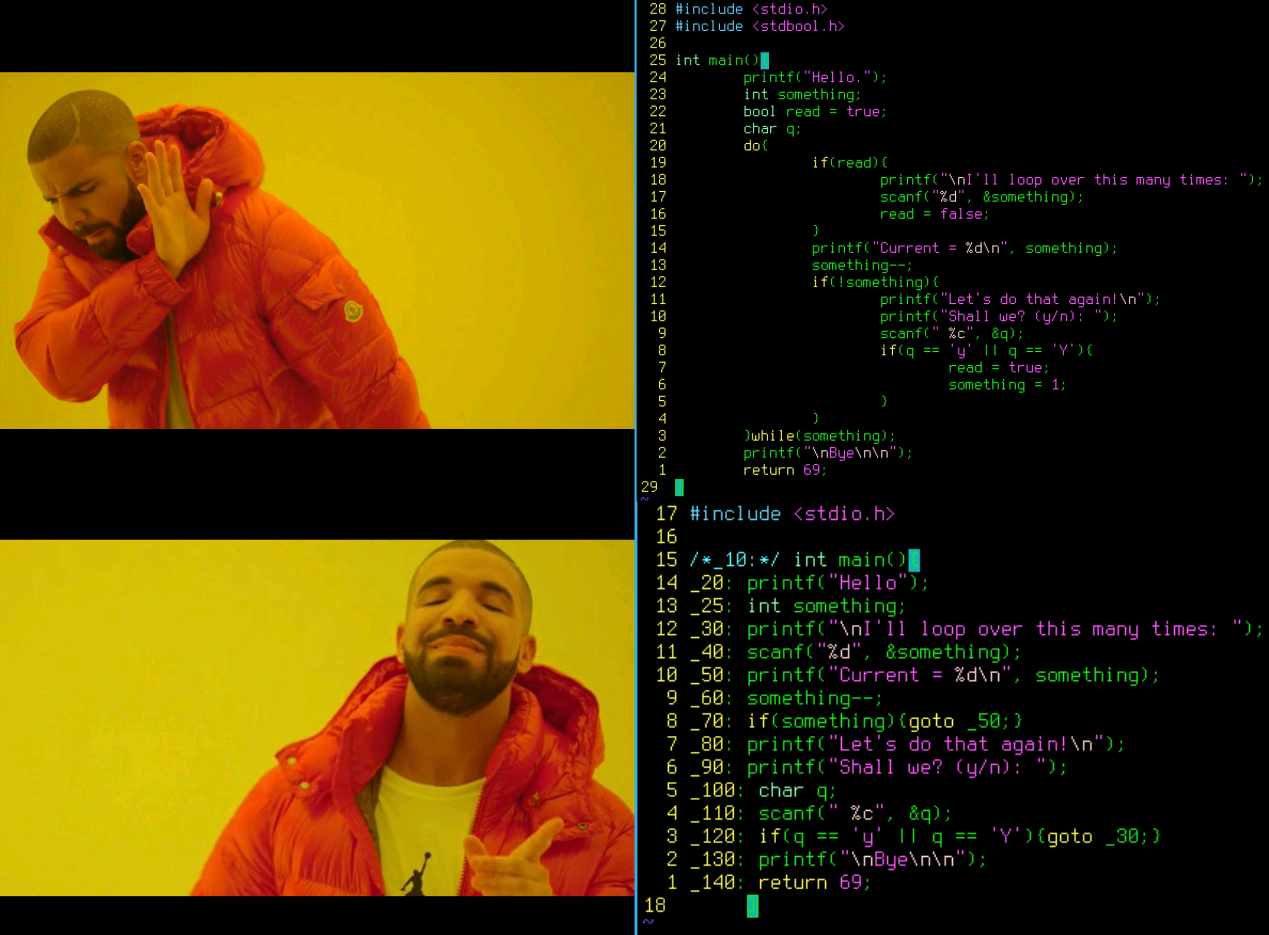 But anyway, I kind of like goto too much. I find it more intuitive to just jump around and re-use parts rather than think about how to do loops without too much nesting.