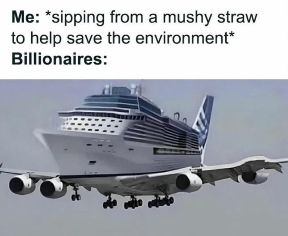 Fuck the billionaires that do that, but that doesn’t mean that me using a straw isnt still making the shit worse. At least I can sleep at night knowing I am not making the situation worse, and I will still try to vote for politicians that are fighting against the billionaires