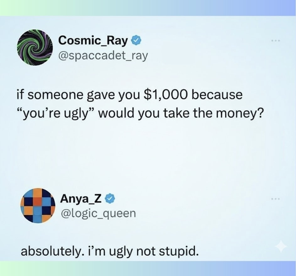 ickplant@lemmy.world to Lemmy Shitpost@lemmy.world · 3 days ago$1,000 richerlemmy.worldimagemessage-square38fedilinkarrow-up1964
