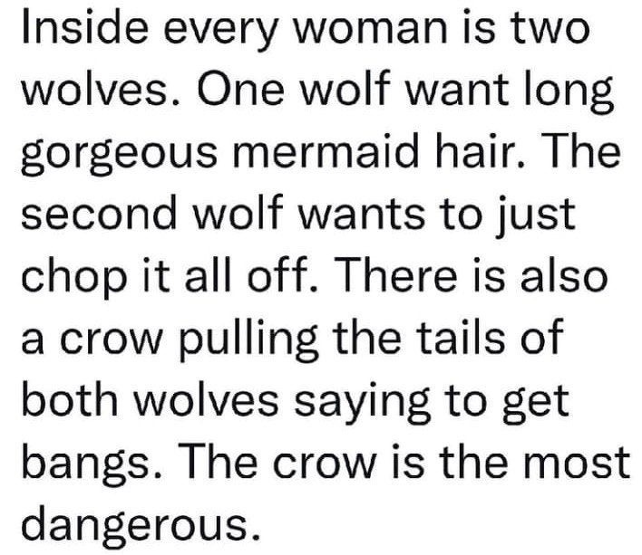 Very accurate. I’ve finally reached that butt length “chop it all off” part of the circle again. I save a picture of “short hair” me just as a reminder not to go all the way. The crow can heck off. I like bangs.