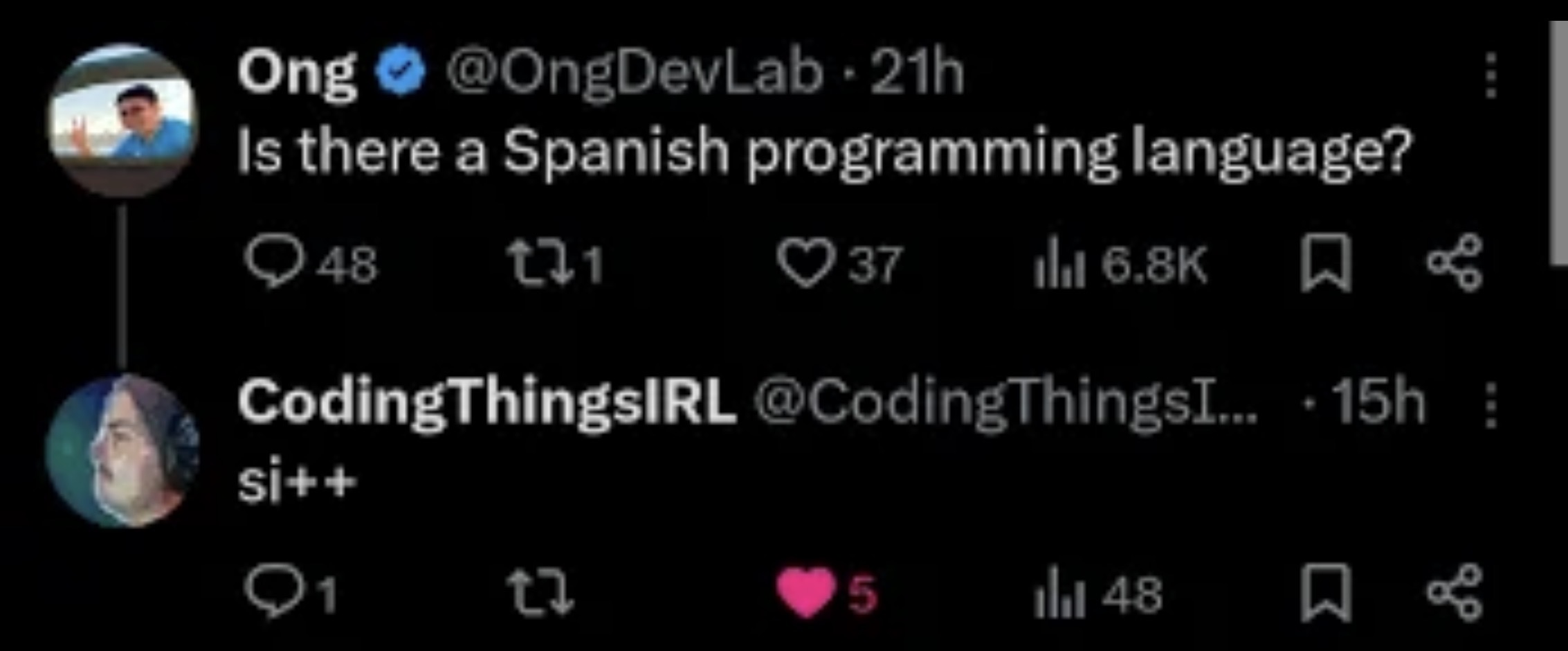 - Sí - A direct translation pseudo-language for coding in C and C++ with Spanish keywords. (from Wikipedia) - it’s real - Lua should be in Portuguese. - Python should be in snek. - Java should be in the infernal tongues. Or one of the many languages of Indonesia 🤷