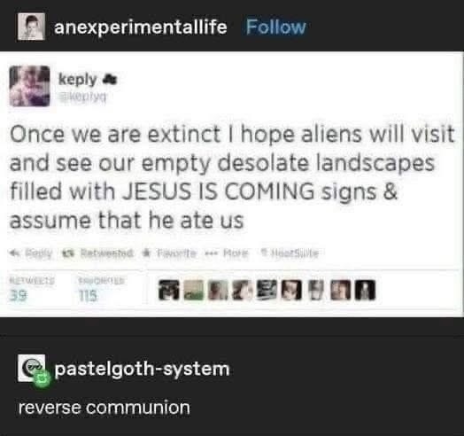 ickplant@lemmy.world to Lemmy Shitpost@lemmy.world · 7 days agoEaten by Jesuslemmy.worldimagemessage-square9fedilinkarrow-up1620