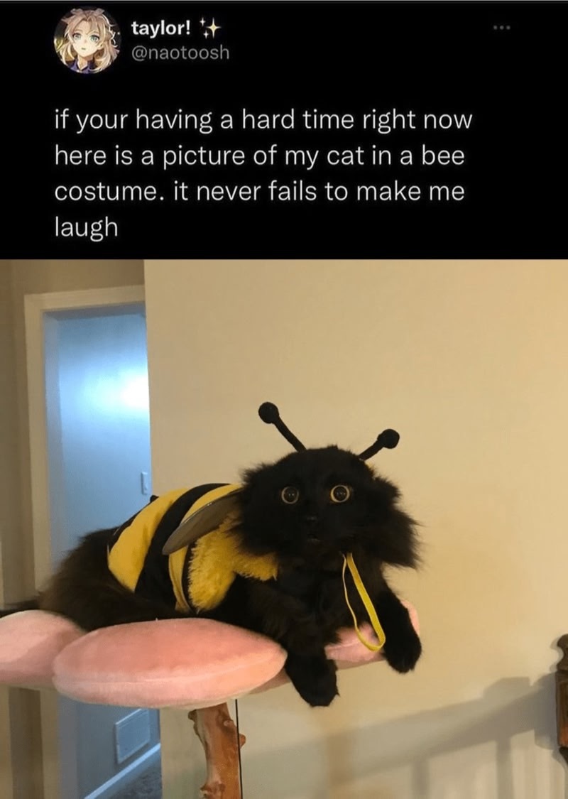 I don’t have time to find it right now but that GIF or video of the cat in the bee costume falling over gets me every time