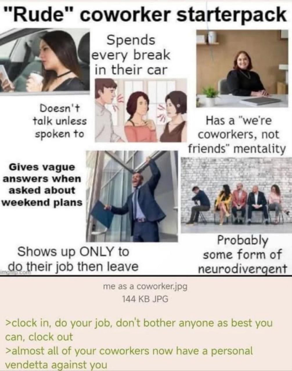 I kind of get the meme, sometimes doing small talk and little things for each other makes work less tedious and keeps the vibe up.