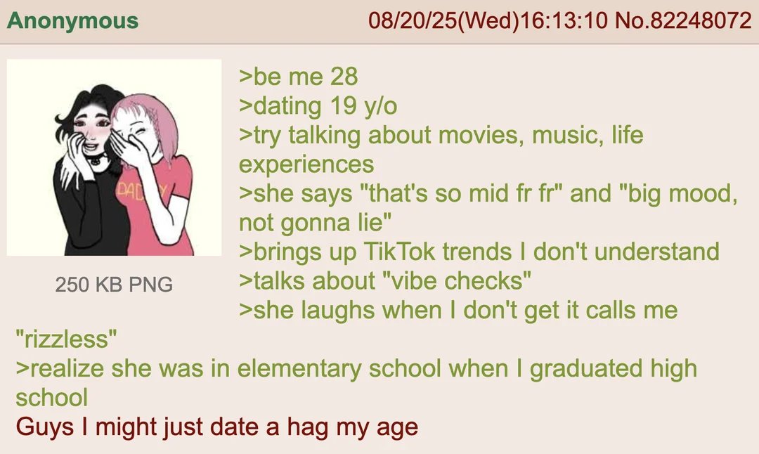 OP is still on 4chan. Lingo aside I’d say he’s in his maturity range.