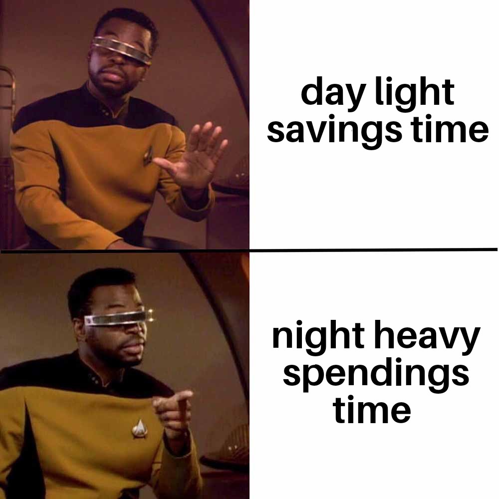 So, this actually provides an excellent example of a common misconception. It’s daylight saving time, not daylight savings. Because it’s not like a savings account for time, instead, it’s the time for saving daylight. Daylight-saving time.