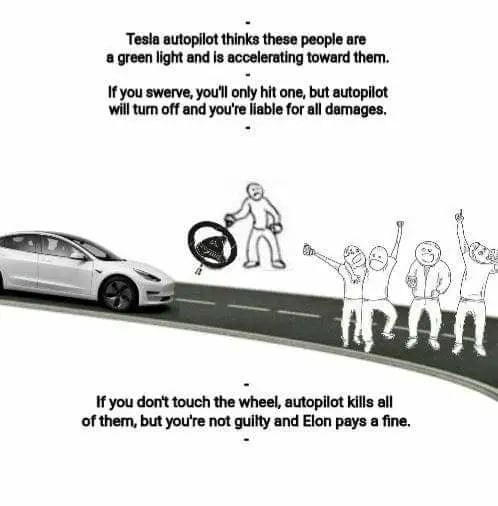 minus-squarerandoot@lemmy.worldlinkfedilinkarrow-up0·11 months agoHa only if. Autopilot turns off right before a crash so that Tesla can claim it was off and blame it on the driver. Look it up.