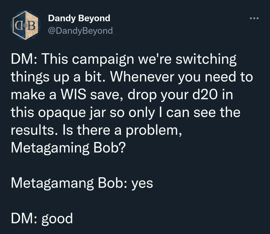 My DM last week decided to have this weird fucky thing in the area that we were at. Some fucky wucky magic that was making it so after every roll (except for attacks) the DM made another roll to determine odds or evens. If it was evens, your roll worked as normal. If it was odds, your roll was reversed so that your nat 20 would become a nat 1. But that also meant if you ended up with a nat 1 and he rolled an odd, you’d get a nat 20. This happened twice. We were all laughing nonstop because like… none of us could have metagamed it if we wanted to. And some of us roll physically and others on dnd beyond. DM just trusts us. So when I said a Nat 1 at one point with a pained sigh, I had forgotten about his odds/evens thing. He rolled and started laughing and then we all started laughing as the roll went through stupendously well.