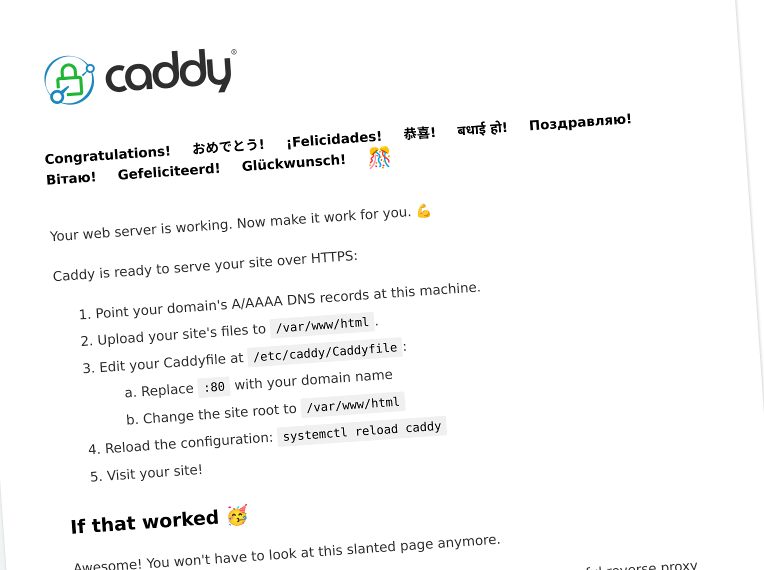 Would someone kindly walk me through setting up reverse proxy to my stuff with Caddy? I really just want HTTPS support, as my media files are one thing, but hosting all my personal info/docs on NextCloud is quite another thing to potentially expose…I want to make sure I harden properly, and HTTPS is clearly a part of that, even if I’m running a tailscale VPN. I have done my best following the docs/tutorial so far, but I’ve hit the wall with this “start” page… Here’s what I’ve got: