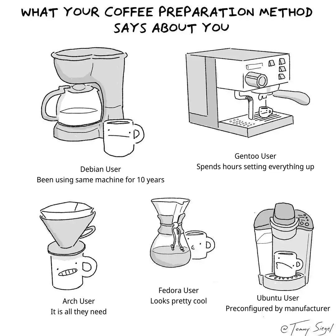 Linux Mint (Moccamaster) it just chugs along and makes the best coffee possible. Fast and reliable.