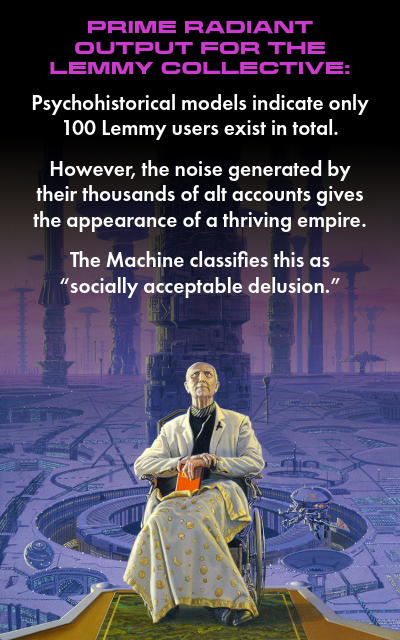 MeatPilot@sh.itjust.works to Sci-Fi Memes@lemmy.world · 1 month agoSunday update from the Prime Radiantsh.itjust.worksimagemessage-square0fedilinkarrow-up11 cross-posted to: lemmyshitpost@lemmy.world
