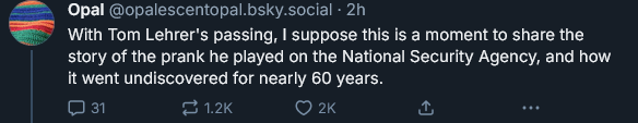 With Tom Lehrer’s passing, I suppose this is a moment to share the story of the prank he played on the National Security Agency, and how it went undiscovered for nearly 60 years.