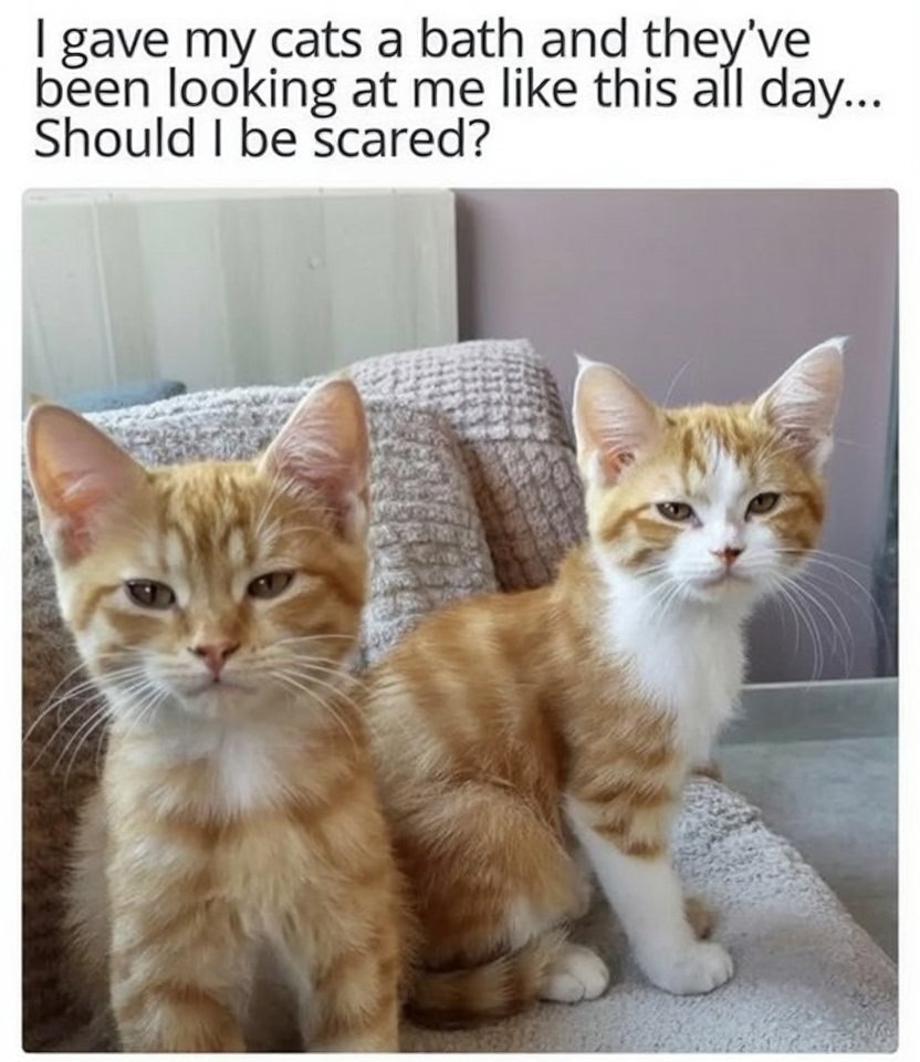 A picture of two orange kittens, both squinting and giving “stink eye.” The caption reads “I gave my cats a bath and they’ve been looking at me like this all day… Should I be scared?”