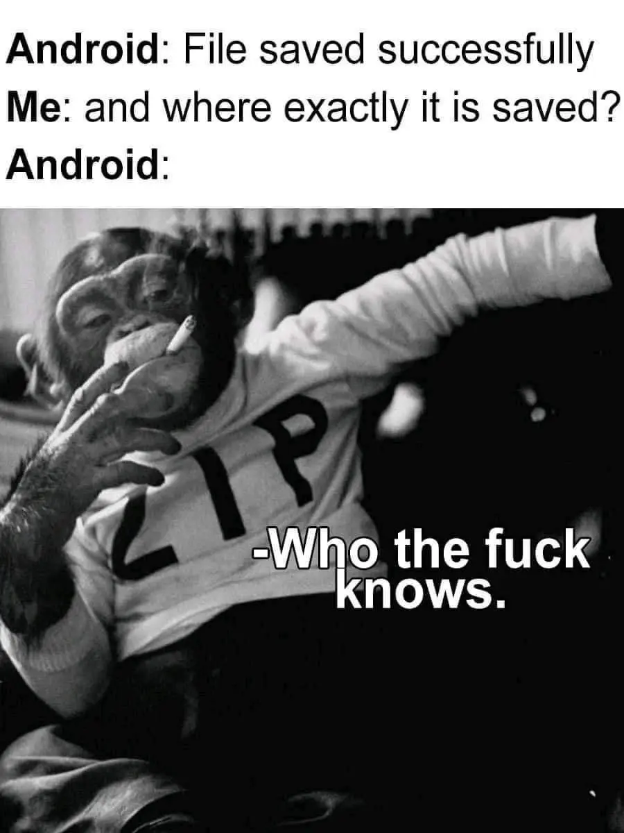 I can find files just fine on my Android phone, BUT when saving files on my iPad this meme would be true.