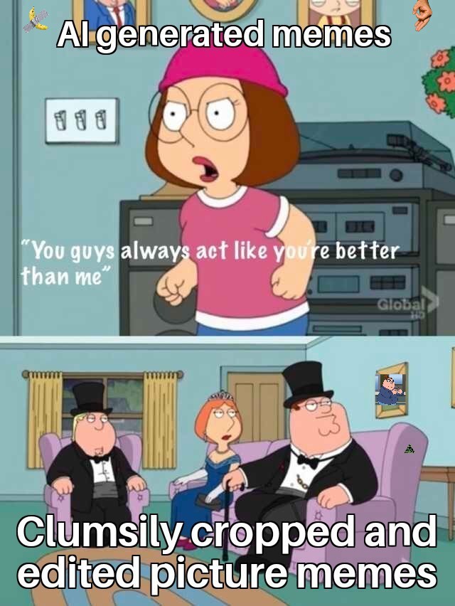 Eh. Meme consumers are riding a pointless high horse on this one. On one hand yes there is arguably a human aspect to manual creation thats lost and theres still plenty of screwups in generated details if you look closely. On the other hand memes and edited silly cat pictures are not high art, they’re the low effort fast food quick consumption equivalent of images. We call them shitpost, I mean come on.