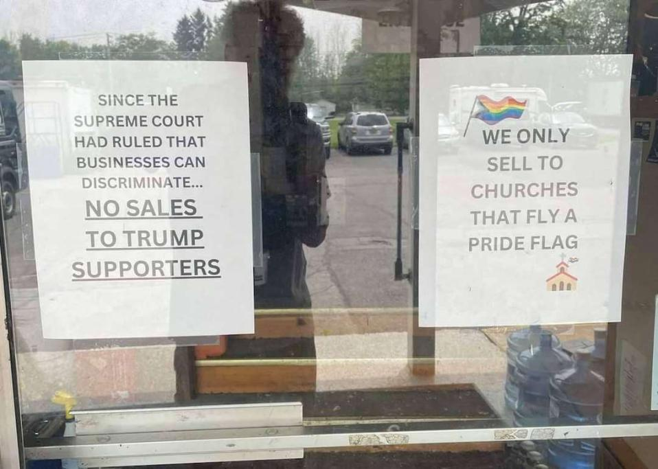 Left sign says "Since the supreme court had ruled that businesses can discriminate…NO SALES TO TRUMP SUPPORTERS.