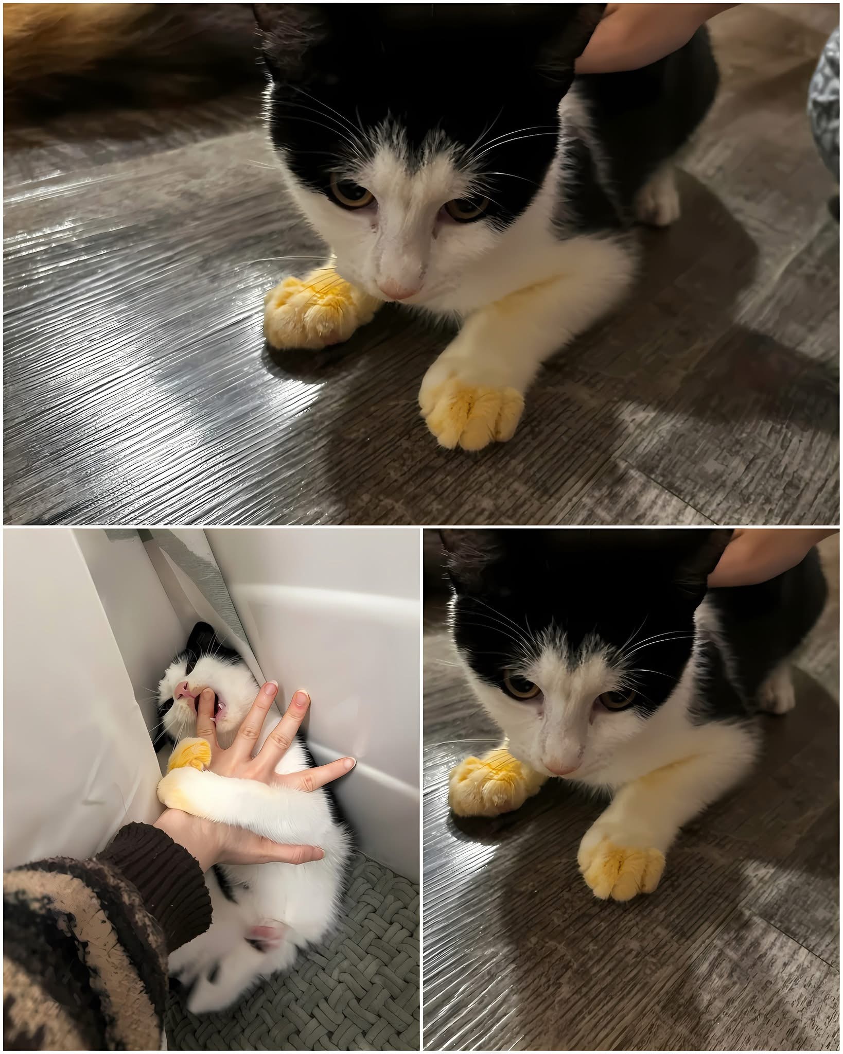 A collage of three pictures of a tuxedo cat with white paws stained orange.