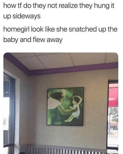 Clearly that baby is calmly falling from a great height and this heroic women has taken a flying jump to catch the child. She’s smiling because she likes catching things.