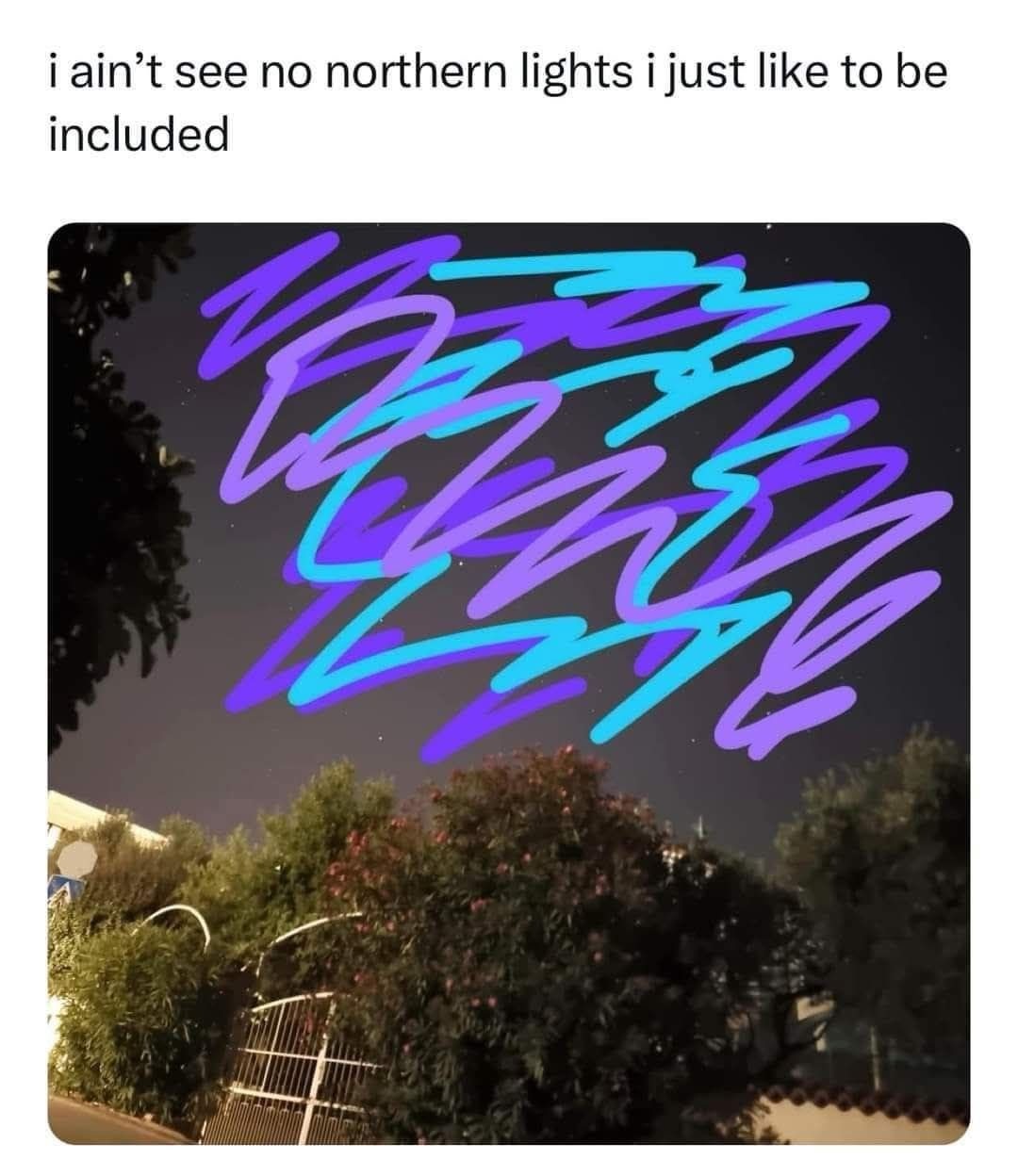 A picture taken outside with some trees in the background. The sky has blue and purple scribbles made in what looks like MS Paint. The caption reads “i ain’t see no northern lights i just like to be included”