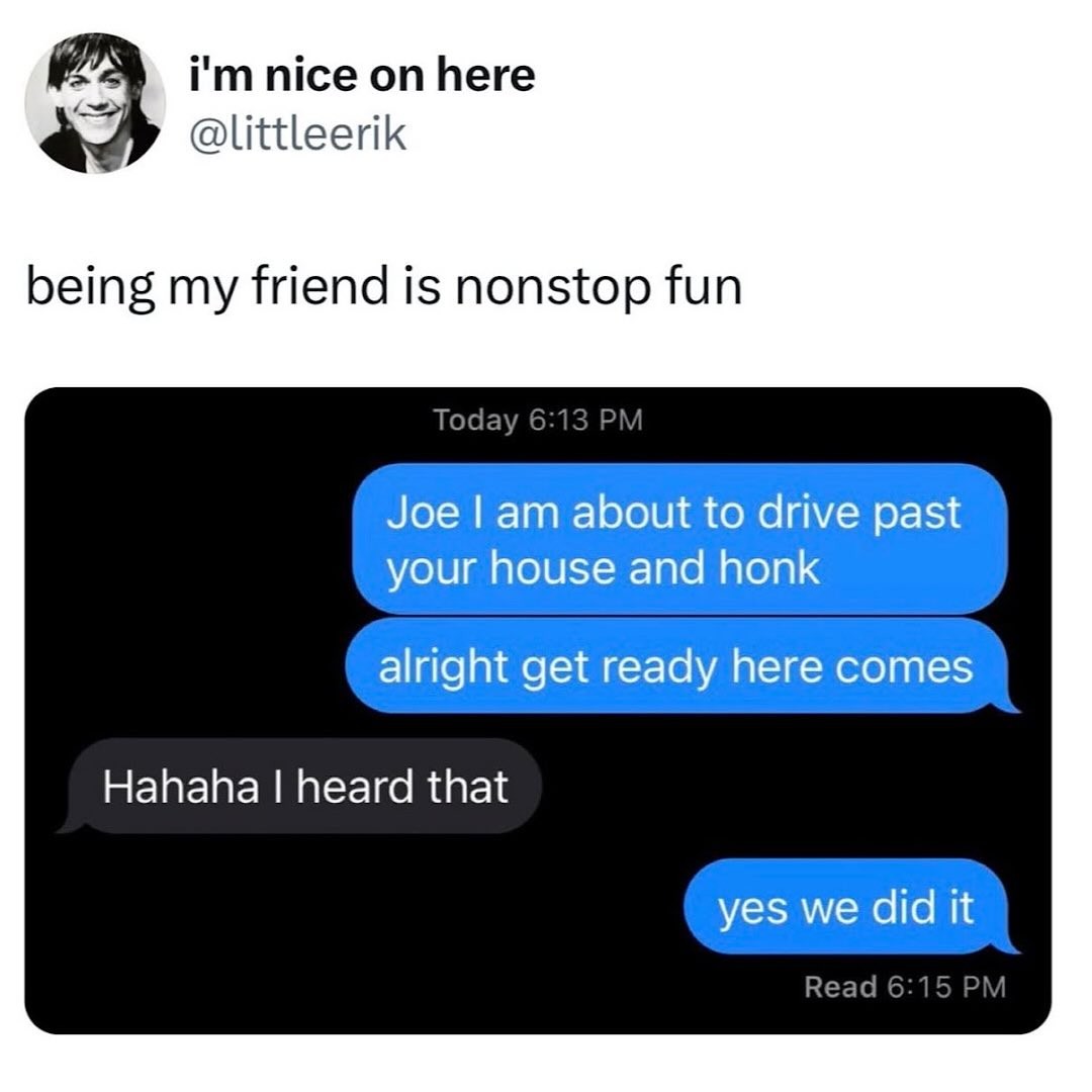 minus-squaretoynbee@lemmy.worldlinkfedilinkarrow-up9·2 days agoMy theory (or perhaps more accurately, hope) was that they were parked nearby, say at a local grocery store; from there they sent this text, then left the parking lot, honked, and parked once again at their nearby home before sending the final text.