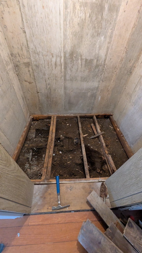 As you can see I have a floor that appears to be a stepped concrete pit, filled with quite a lot of dirt, and what I believe is probably a tie in to the sewage drain.