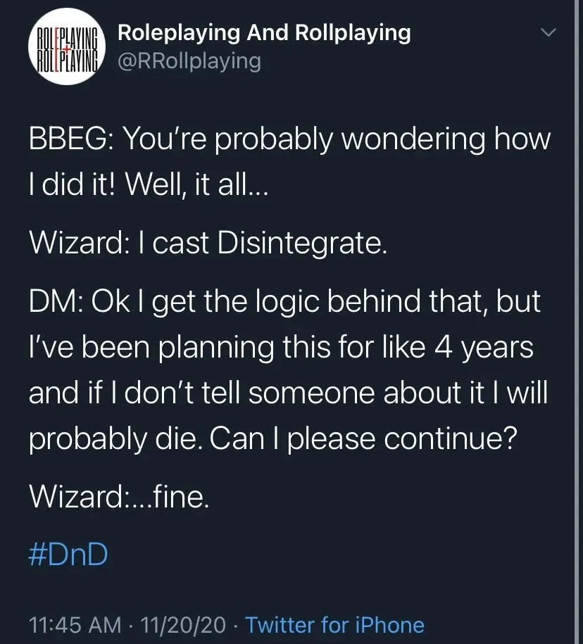 I remember seeing someone describe a BBEG’s monologue as the DM saying farewell to the character. And yeah, pretty much.