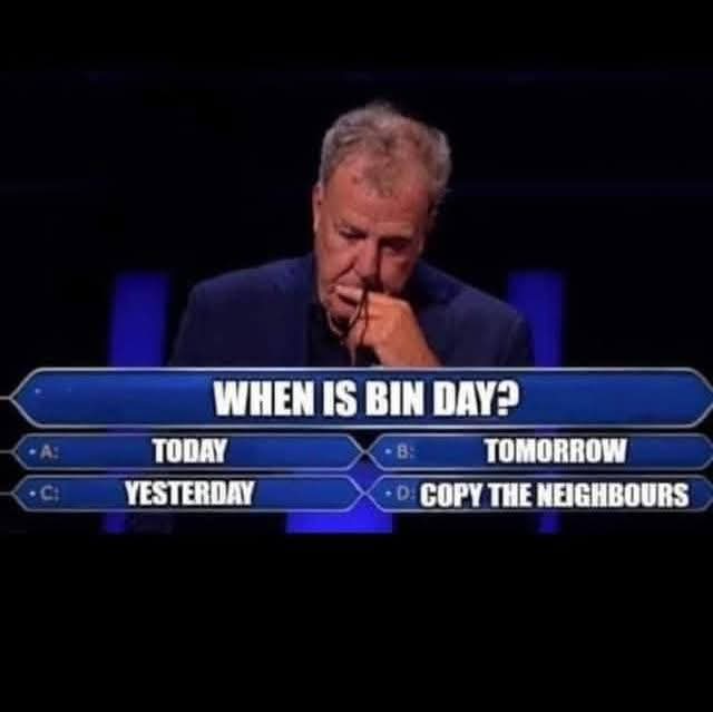 Now knowing if its recycling that week, thats wizardry and I just go based off how full my recycling bin is or if my neighbours have theres out.