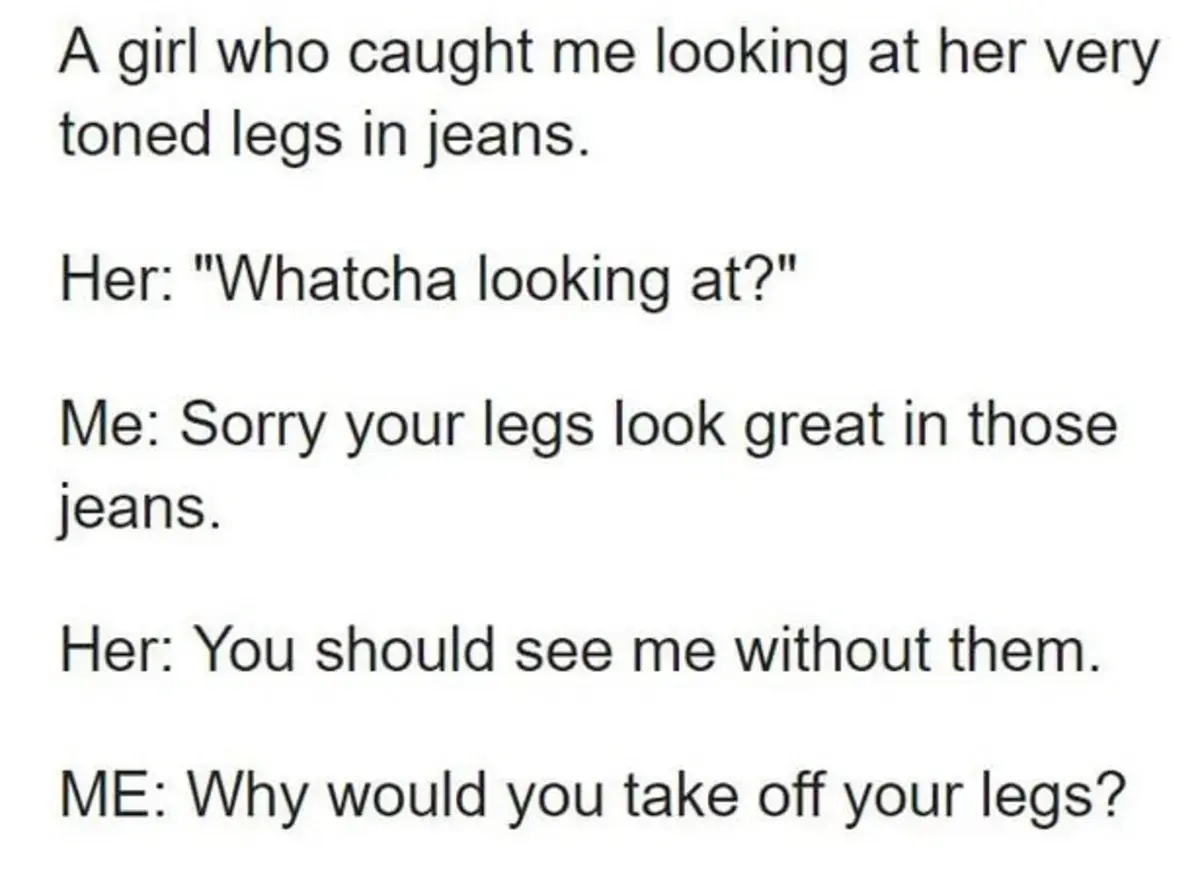 minus-squareReCursing@feddit.uklinkfedilinkEnglisharrow-up58·24 days agoMy partner has a prosthetic leg, so “to go to bed” would be a valid response