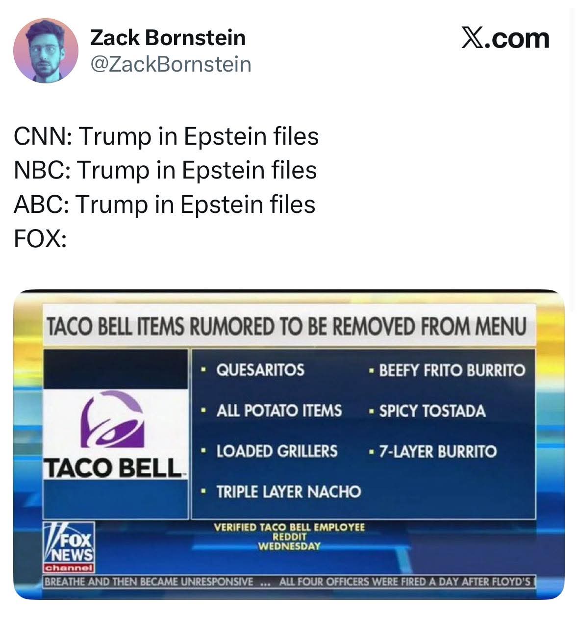 To be fair, everybody already knew about Trump being in the Epstein Files. Taco Bell getting rid of the cheesy potatoes would be devastating and is indeed important to know about.