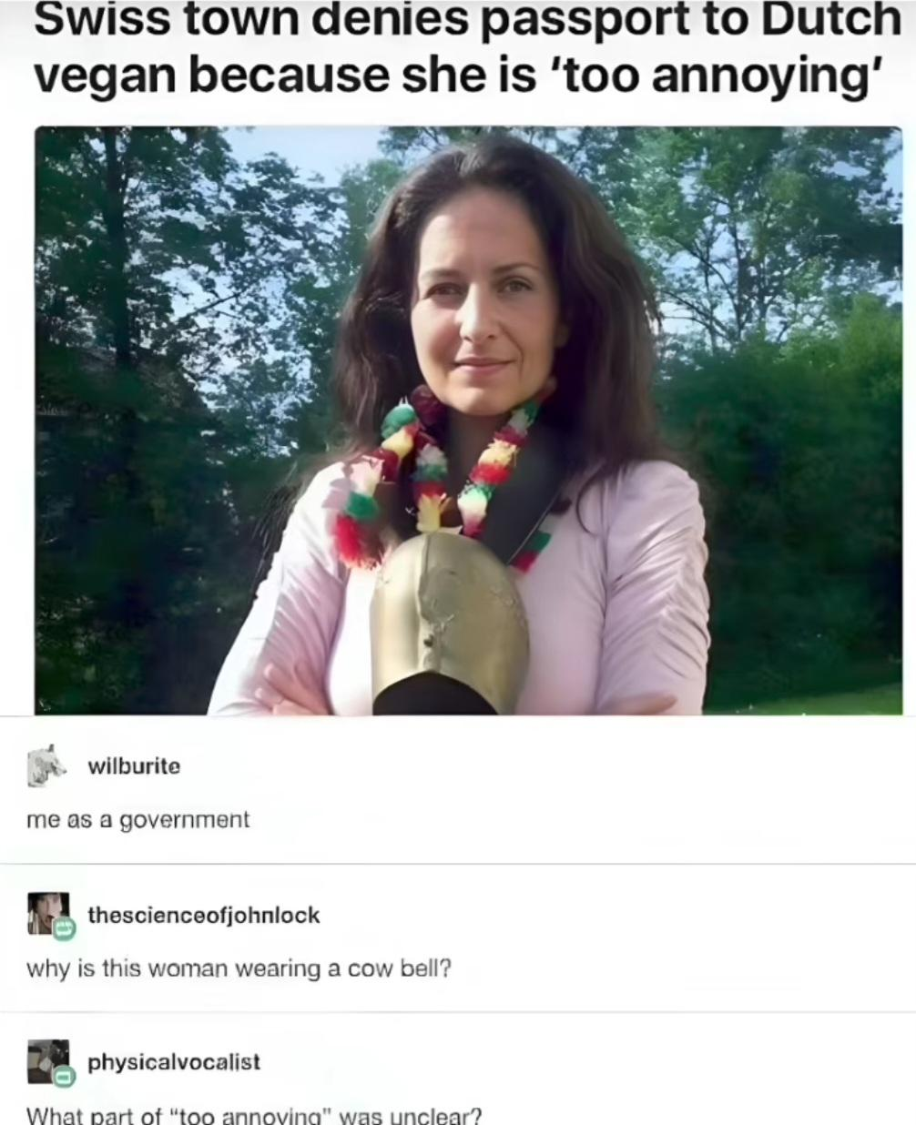 Some context: This woman was trying to prohibit farmers from equipping their cows with bells, because she felt that they made too much noise. The population in this rural and traditional village did not like that, as they disliked people interfering with their traditions (especially since she was no swiss citizen). Some months later, she asked for naturalization, which was promptly denied by the popular vote in the village.