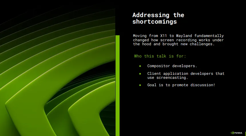 In addition to showing the need for unifying DRM driver-side APIs within the Linux kernel, NVIDIA’s Linux graphics driver team at XDC2025 also showcased the shortcomings of screencasting under Wayland.