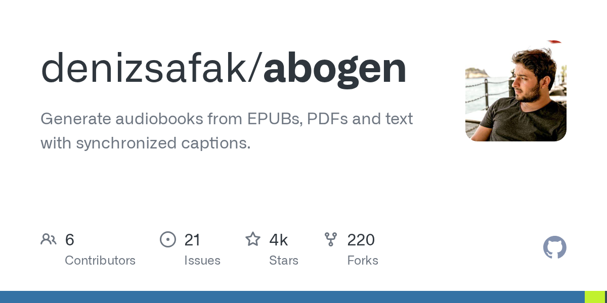 cm0002 to Today I Learned (TIL)@lemmy.caEnglish · 3 hours agoTIL about abogen. A tool to generate audiobooks from EPUBs, PDFs and text with synchronized captions.github.comexternal-linkmessage-square0fedilinkarrow-up112