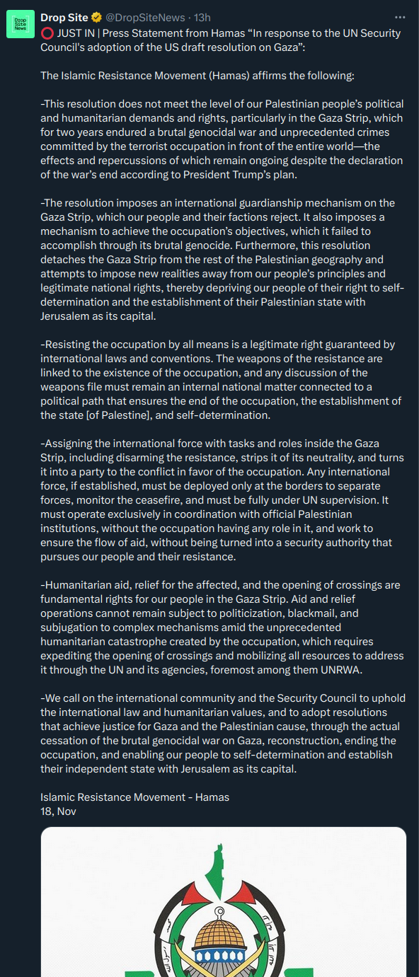 arrow-up14imageHamas statement on the UNSC resolution on Gazalemmy.mlcm0002 to Palestine@lemmy.dbzer0.comEnglish · 2 hours agomessage-square0fedilink
