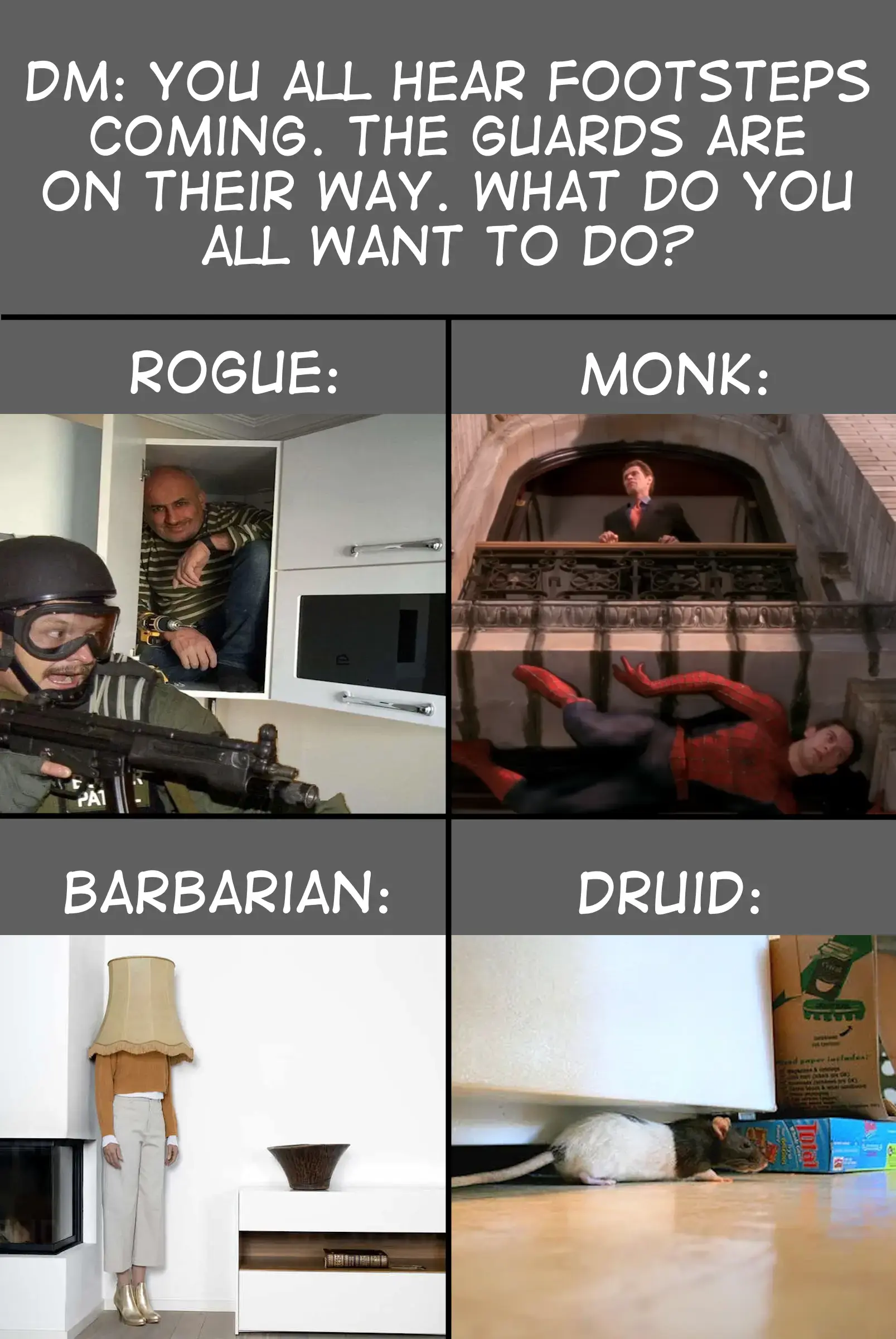 About a decade ago, I rolled a druid/rogue hybrid, almost entirely so I could scoot around, as a rat, scout things out, give a layout of what we’re getting into back to the party, act as a surprise flank when the rest of the party engages, take out numbskulls too busy fighting to notice the rat behind them and around a corner, animorphing into an elf/human halfling, with daggers.