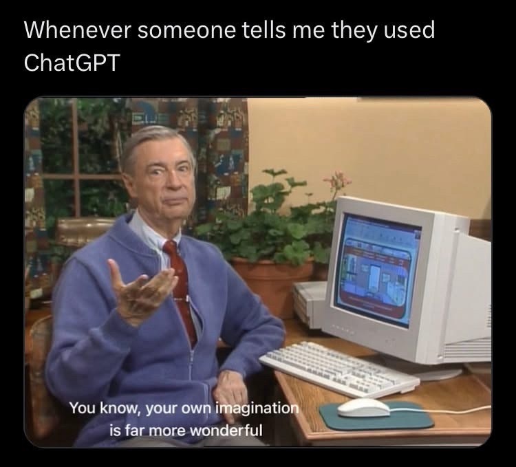 ChatGBT said this offers a refreshing take on the meme format and bringing the wonderful Mr. Rogers into the conversation to highlight the disparity between user generated memes through me versus human generated memes truly showcases your knack for originality.