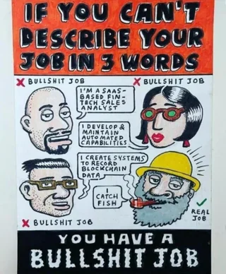 Basically, their view is that if you are not directly making the product or apart of the physical logistics for that product, then you’re in a bullshit job. I would not say I agree with the philosophy myself, but i kind of get it. ‘I farm Corn’, ‘I Truck frozen food’, and ‘I catch fish’, do exist in a very different realm from ‘I manage a team of QA specialists’, ‘I am an Advertisement Consultant’, and ‘I contribute to my company’s server backend codebase’.