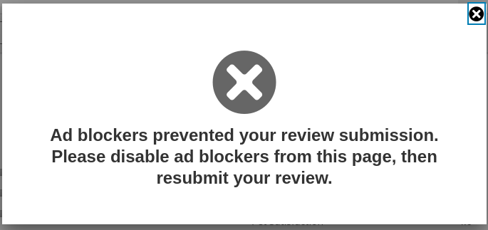Is it possible that their review form functions on some kind of script language that is commonly filtered by ad blockers?