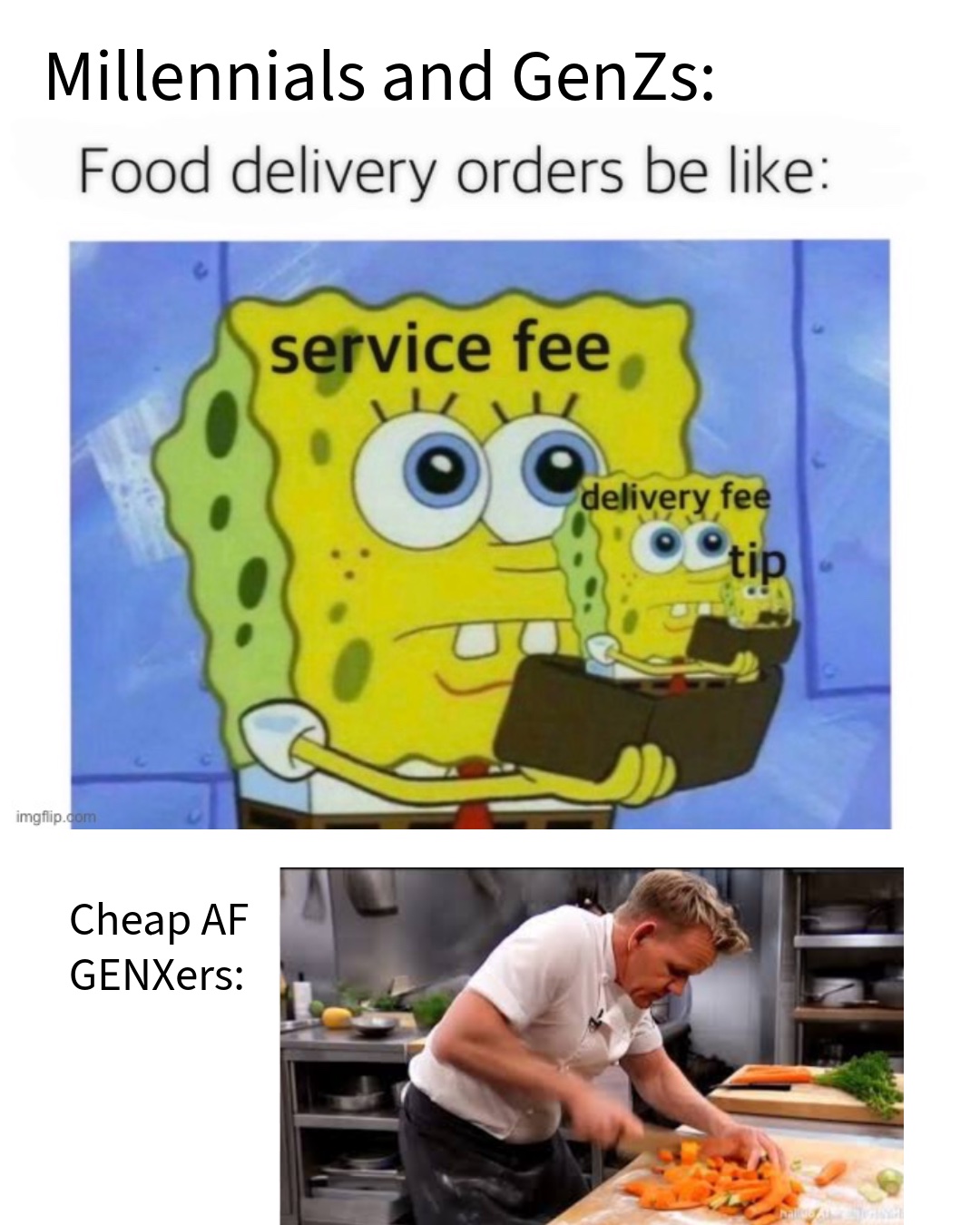 Millennial here. I cook most of my own food. Have never and will never use services like door dash, cuz I don’t want to pay extra to give some stranger unmonitored access to my food. I will tip when I eat out, even though I hate it - for fuck’s sake just factor the tip into the price of the food… my whim as a customer shouldn’t determine if someone else’s employee gets a fair wage.