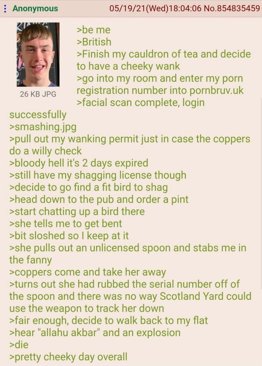 The only thing to make it better would be to change it to “die thankful, to the terrorists for freeing me of this place” or for the last line, “maybe if they hated it here enough to go on living out of spite instead of blowing themselves up, we could accept them as fellow Britons.”