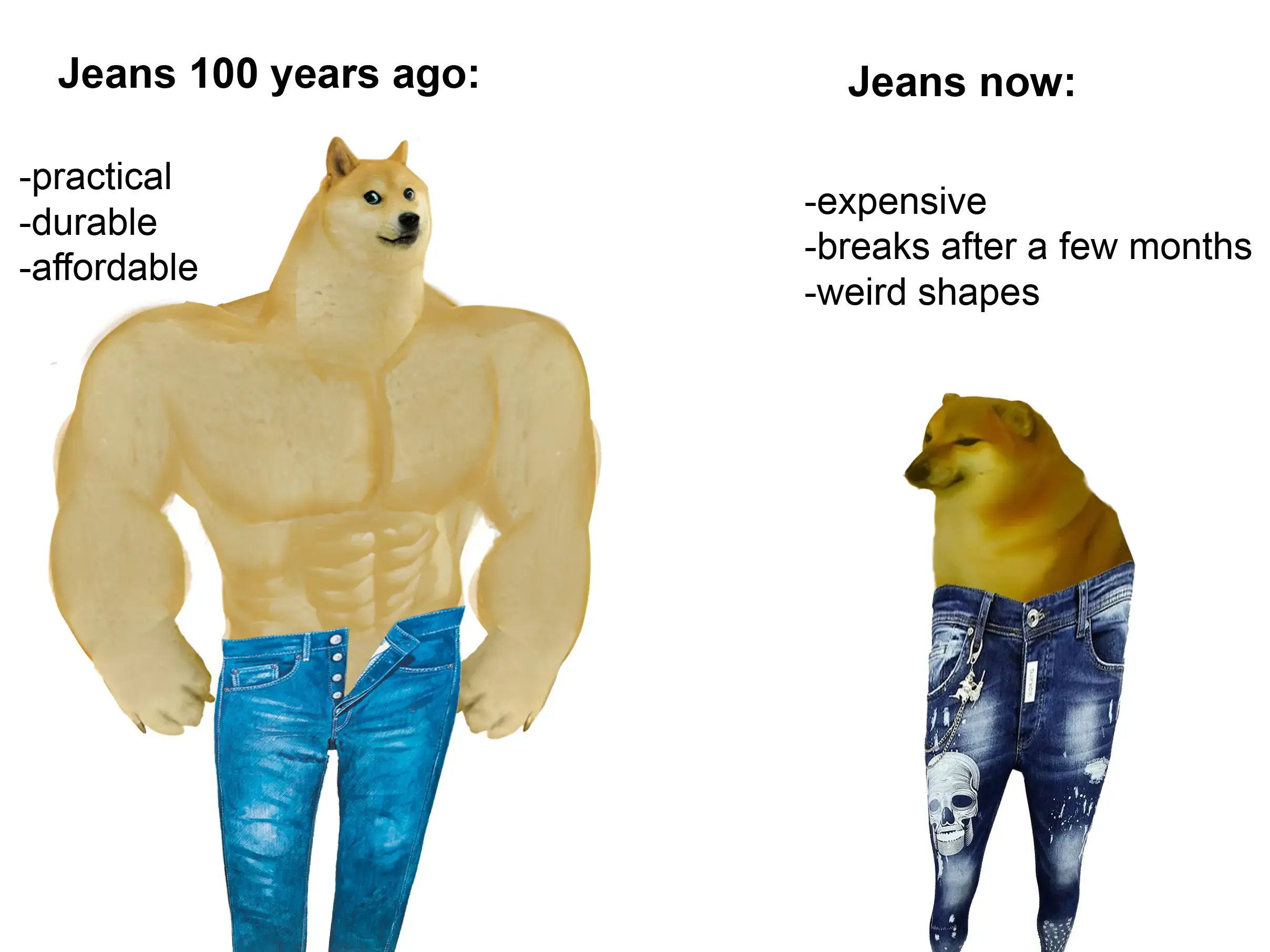 On the other side, I have an old pair of jeans of unknown maker dismissed from my uncle which I use weekly for yard work: ten years in my possession, unwashable stains, destroyed sockets, but the fabric is still perfect.