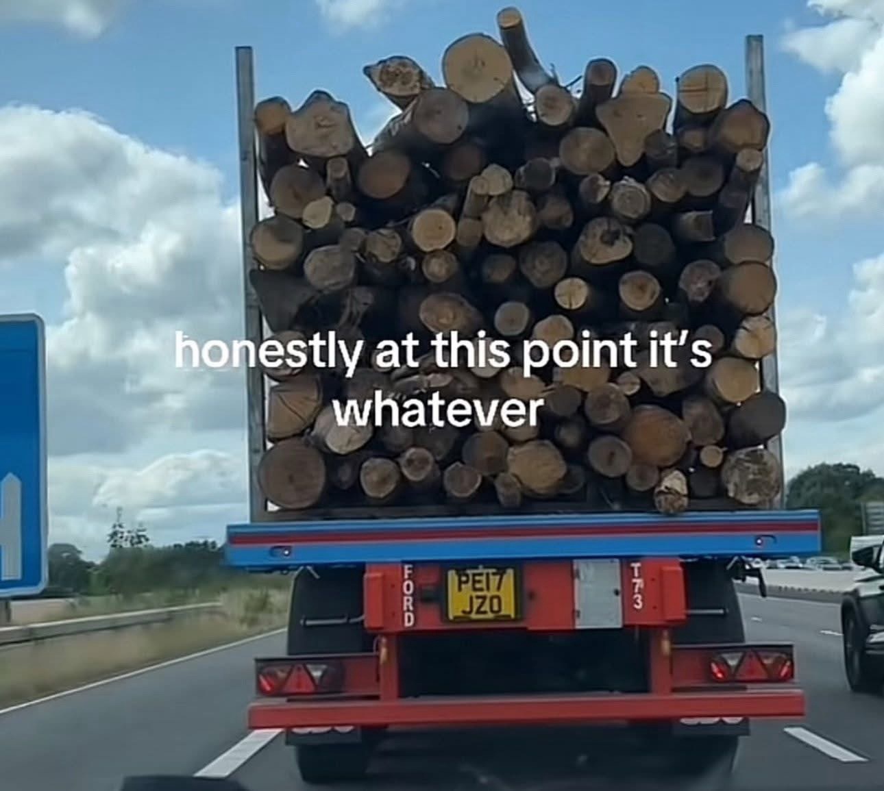 The log was cgi’d, because real logs don’t bounce off the road like rubber balls. And also poorly secured logs are more likely to fall from the side than to slip all the long way to the back.