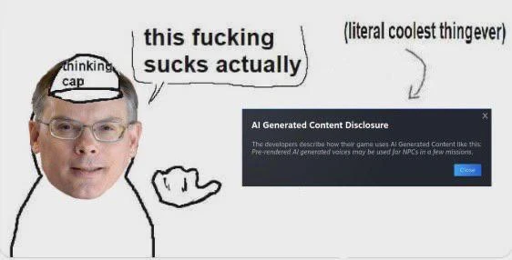 “I used AI to help with the scripting because I suck at coding” might be the greatest game ever just from an individual who doesnt have the skills themselves.