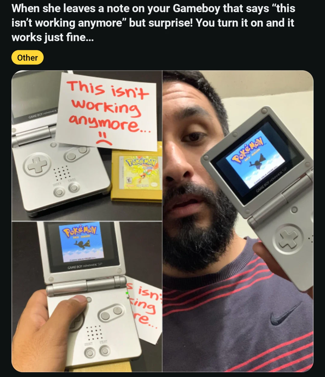 !The joke is that the note is about their relationship, not the Gameboy.!<