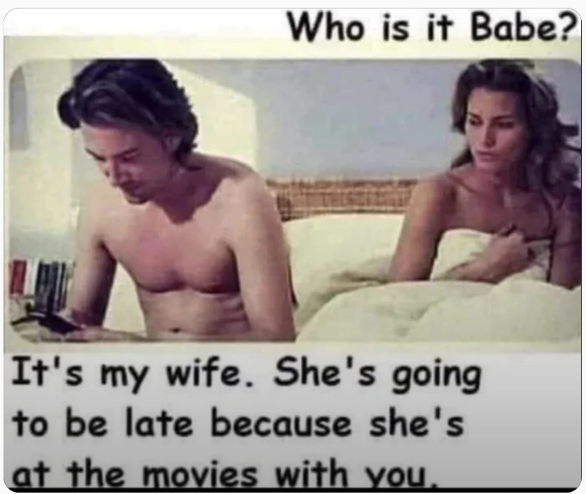 That’s the joke. The wife is also lying and probably also cheating on him.