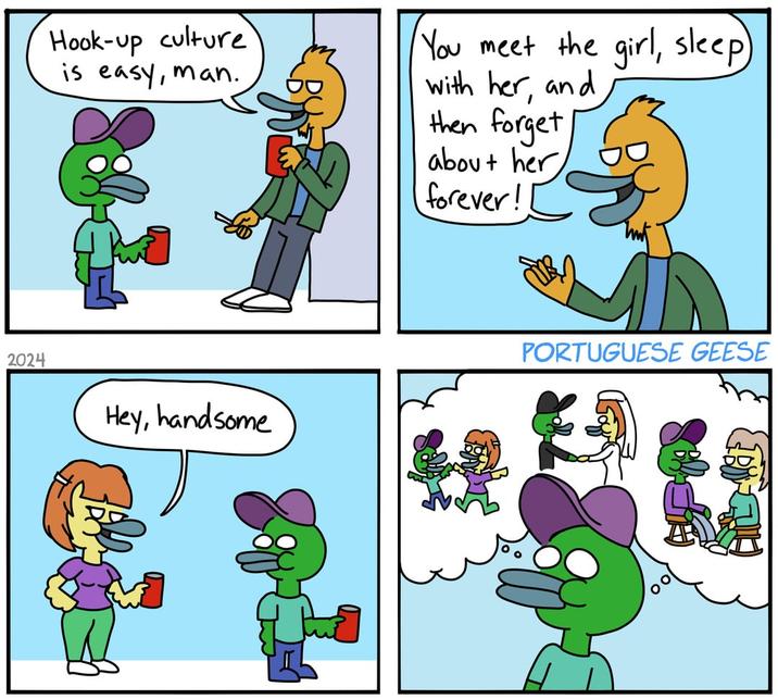 Some ppl romantacize and overthink everything like in the comic(me), some don’t and just live life. In the end, most ppl don’t care about that. And hookup culture isn’t really them fucking complete strangers, they’re usually friends first or communicate in some way.
