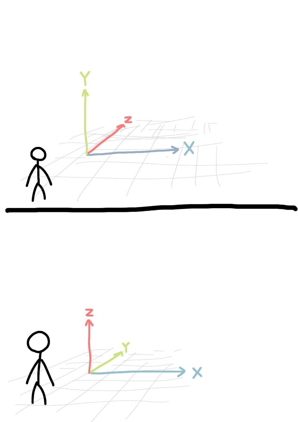 Z is always depth. Both are correct but define different perspectives. Top is looking across the landscape from an arbitrary floating perspective, bottom is looking down with anchored mapping to the surface.