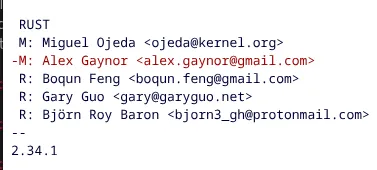 Alex Gaynor recently announced he is formally stepping down as one of the maintainers of the Rust for Linux kernel code with the removal patch now queued for merging in Linux 6.19.